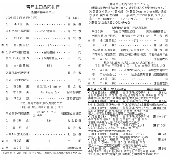 TOPページ > 週報 > 2025.7.13青年主日週報礼拝順序